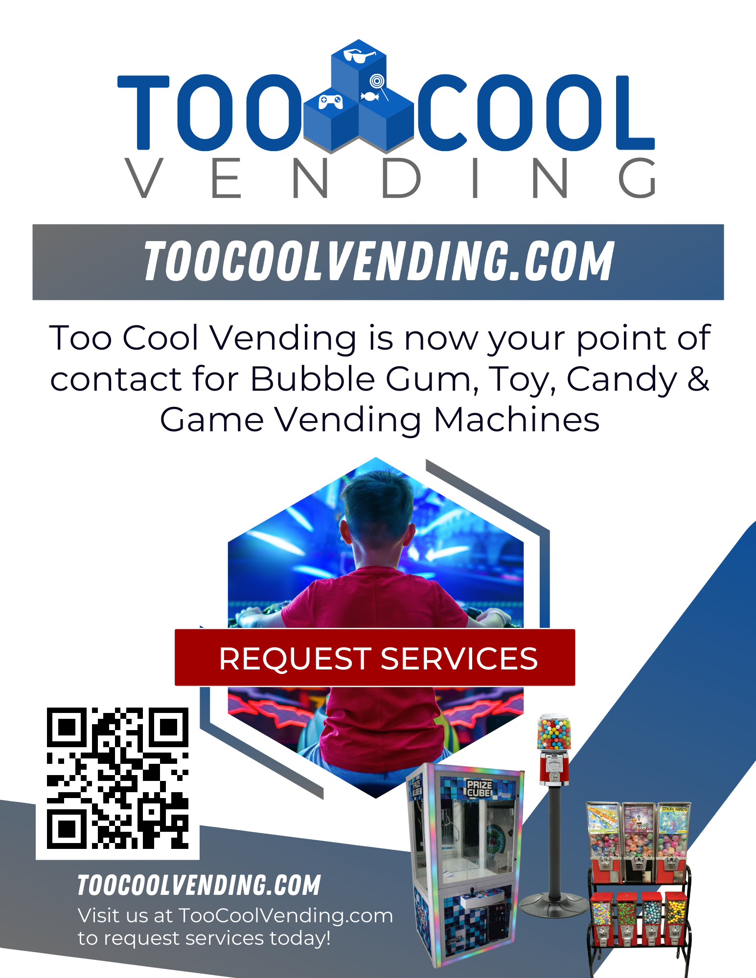 Sweeten up your space with our next generation vending solutions. Too Cool Vending is now your point of contact for Bubble Gum, Toy, Candy, & Game Vending Machines.